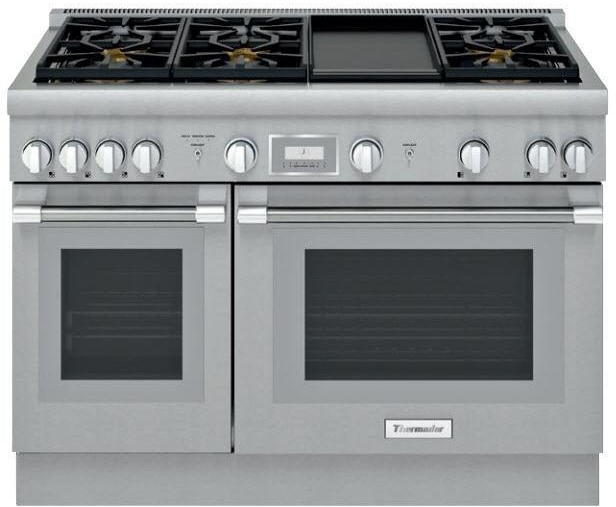 48" Professional Dual-Fuel Cabinet depth (24") Range - All Telescopic Oven Racks- Thermador Connected Experience with Home Connect™ - Six Pedestal Star® Burners (Two with ExtraLow®) - Non-stick surface Electric Griddle - 5.7 cu. ft. main oven cavity. Truly Flush Mounted™, 24" standard cabinet depth.Read More