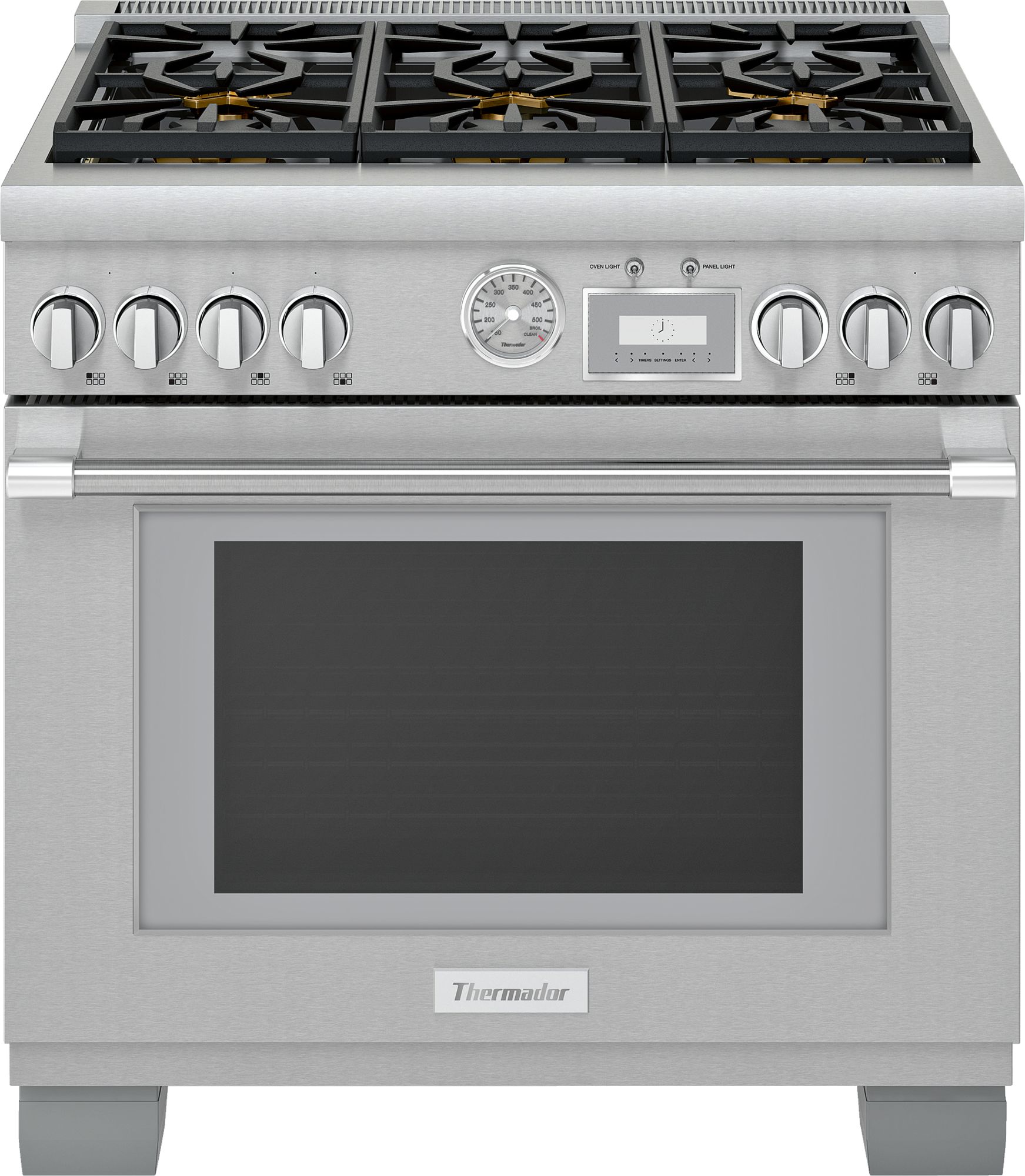 Our 36-inch Pro Grand Range gives you six Star® Burners - 4 with ExtraLow®, and connected oven for remote control and monitoring. Electronic oven display interfaces to cook timer, CookControl™ meat probe and preheat status with audible alert.Read More