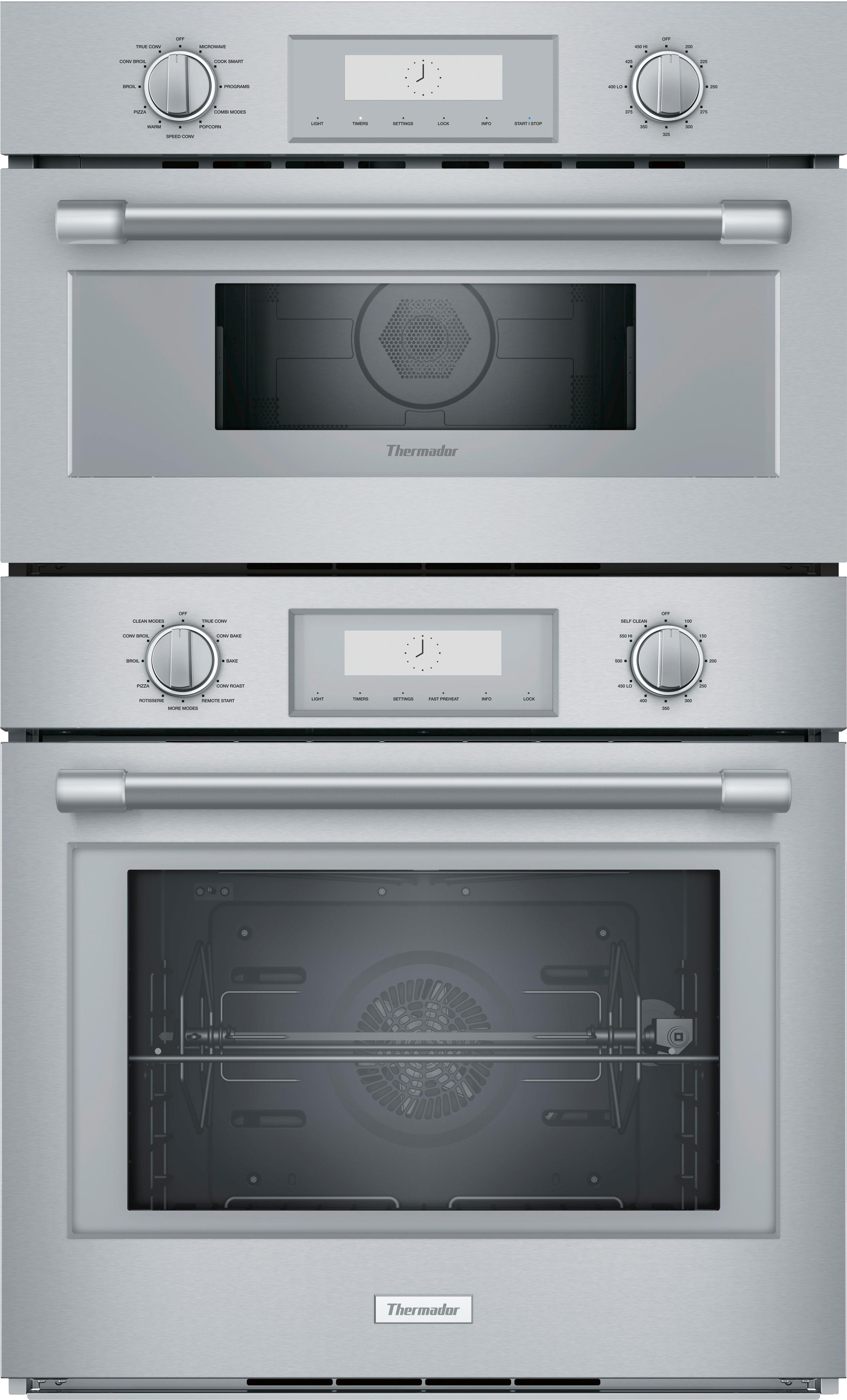 Double Oven pairs a Speed Oven (upper) with a Full Convection Oven (lower). True Convection offers precise airflow for cooking on multiple levels. Multi-point meat probe helps better capture temperature in roasts and poultry. Speed oven with microwave capability can broil and convection bake.Read More